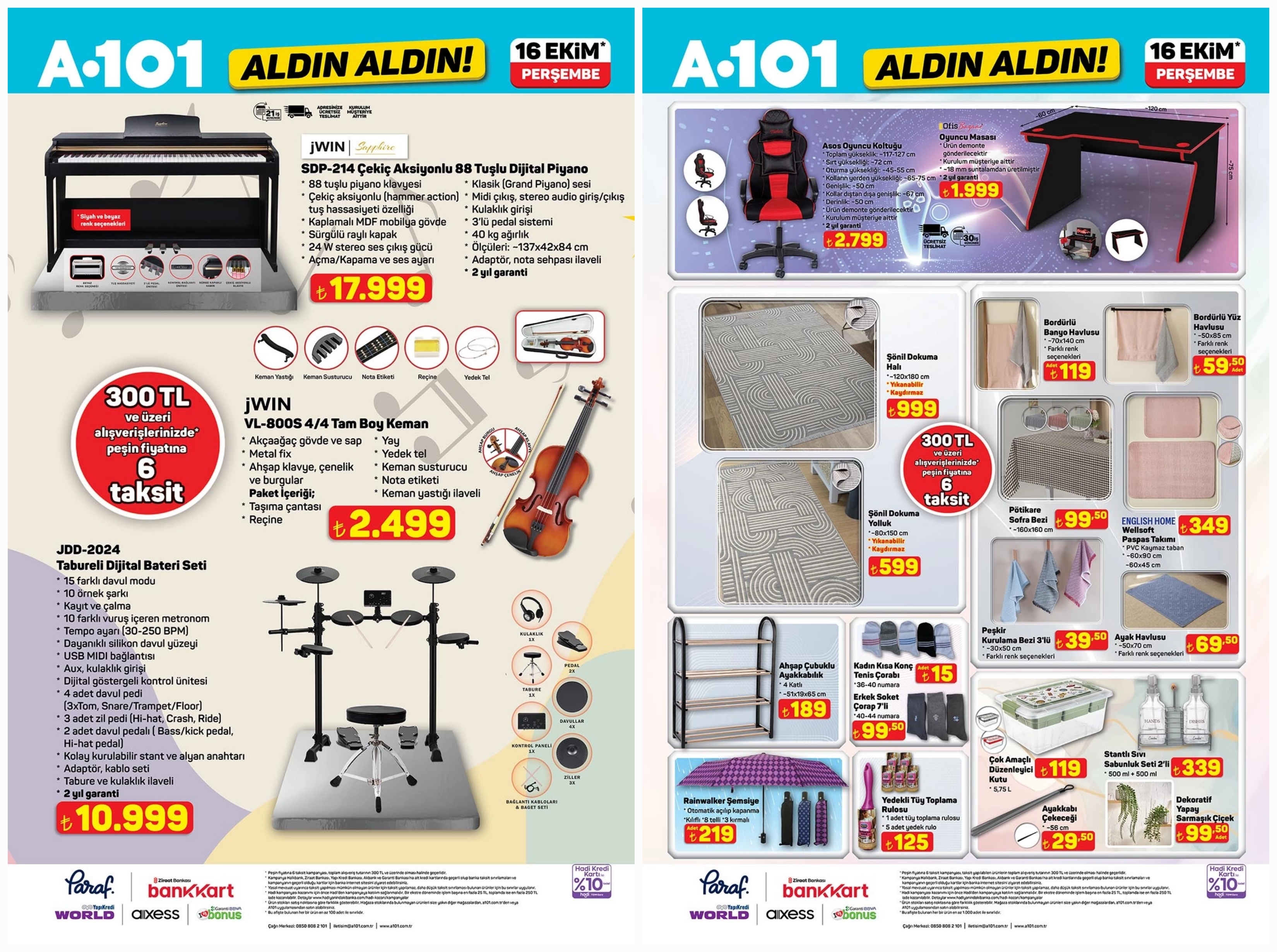 16 Ekim A101 aktüel teknoloji ürünleri arasında dijital müzik ekipmanları yer alıyor. JWIN markasına ait 88 tuşlu ve çekiç aksiyonlu 24W çıkış gücüne sahip olan dijital piyano 17999TL fiyat etiketine sahip. 4 adet davul pedi, 3 adet zil pedi ve 2 adet davul pedalı olan dijital bateri seti ise 10999TL.